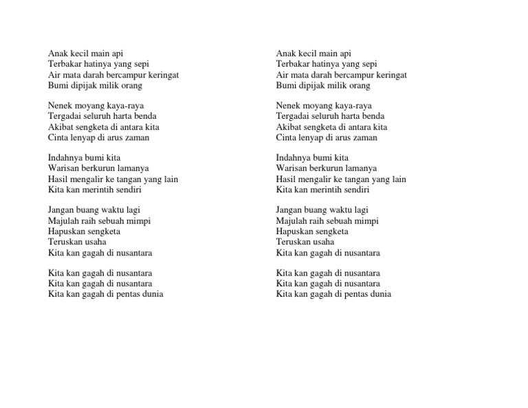Berikut cuplikan syair nyanyian teks dari lagunya. Musik-musik dari Lagu Anak diterima baik oleh masyarakat Indonesia. Anak kecil main api Terbakar hatinya yang sepi Air mata darah bercampur keringat Bumi dipijak milik orang.