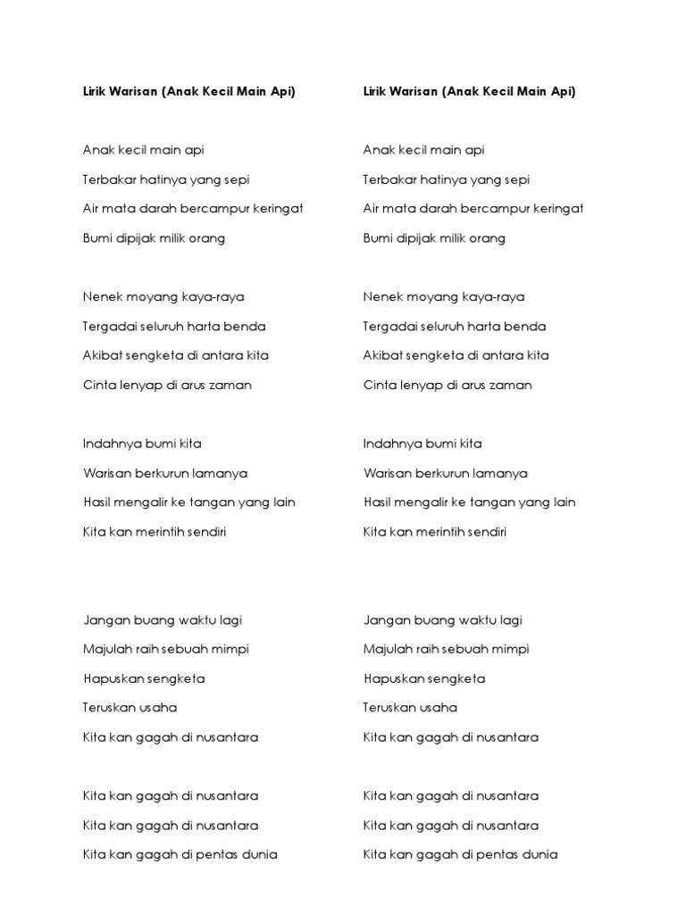 Lirik Lagu Warisan Anak Kecil Main Api Lagu Patriotik. Air mata darah bercampur keringat. Lirik Anak Kecil Main Api Versi Lama Anak kecil main api.