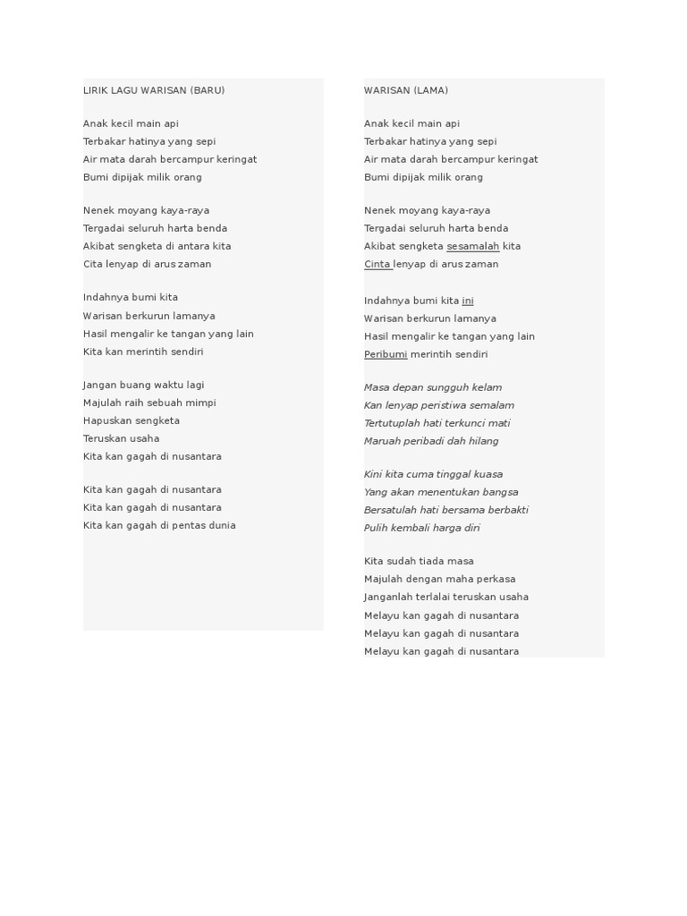 Sebelum nasi menjadi bubur bersama-samalah bermuhasabah diri demi agama bangsa dan negara tercinta ini. Penulis senikata dan lirik lagu Warisan ini ialah Tan Sri Nordin Kardi Pensyarah UPSI. 8 UCAPAN AJAIB UNTUK MEMBENTUK KARAKTER ANAK Berikut ini 8 ucapan atau kata-kata ajaib yang penting diajarkan kepada anak-anak sejak kecil.